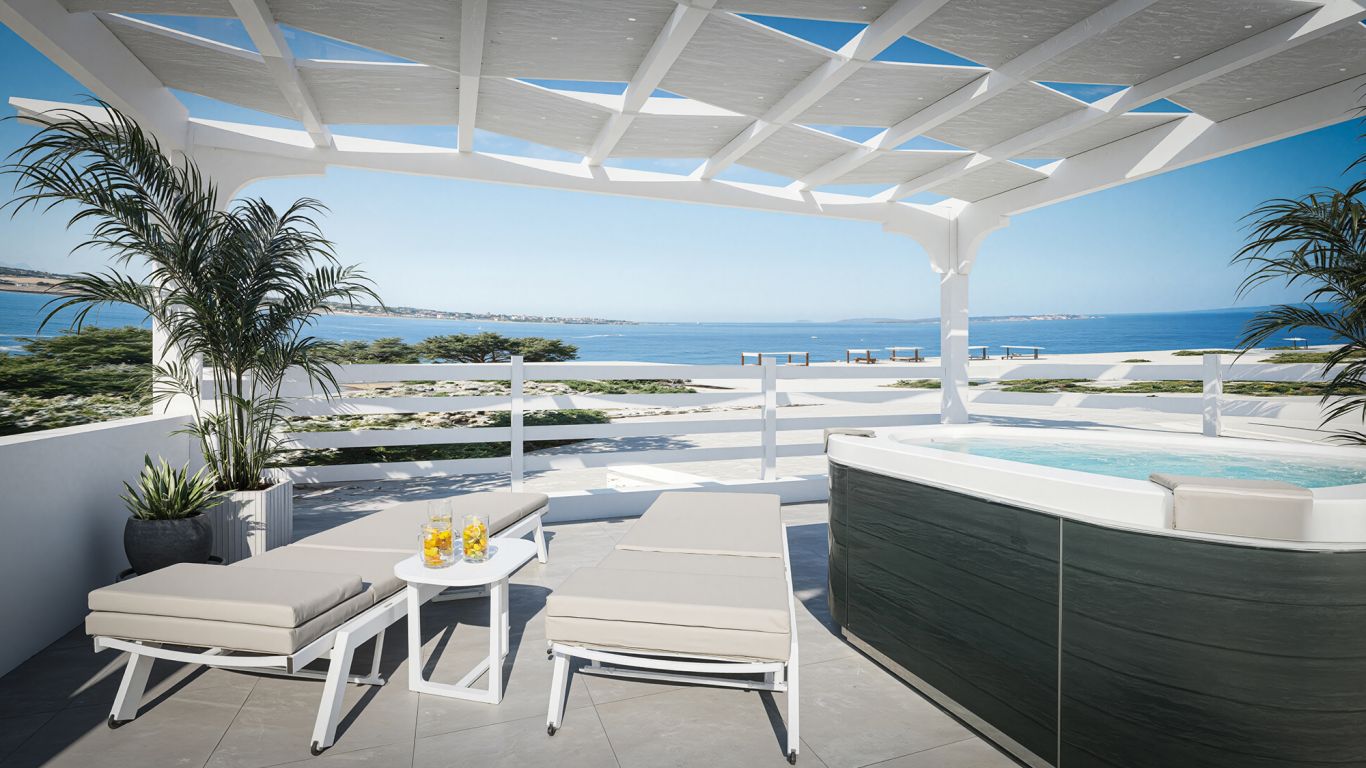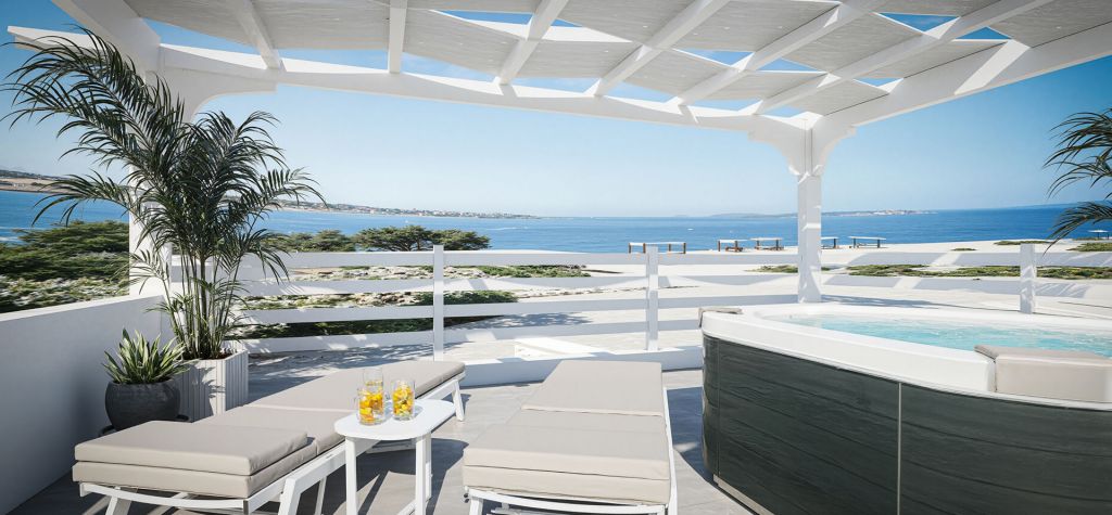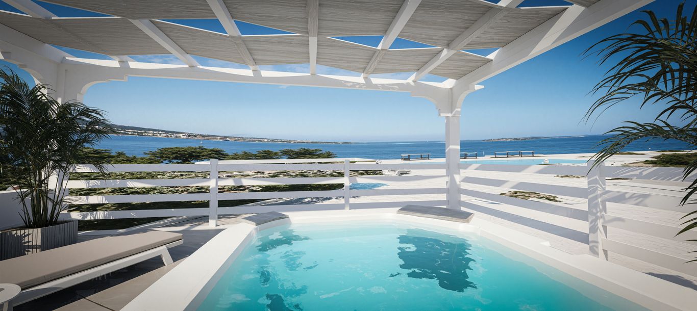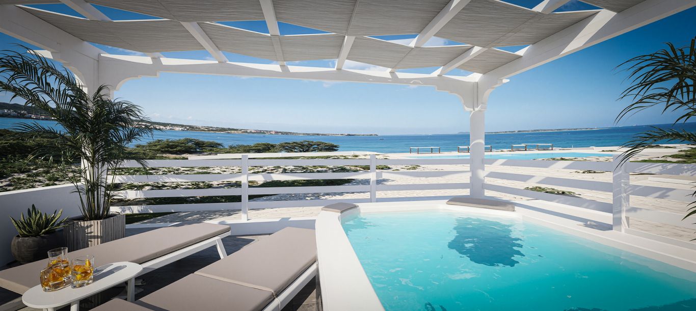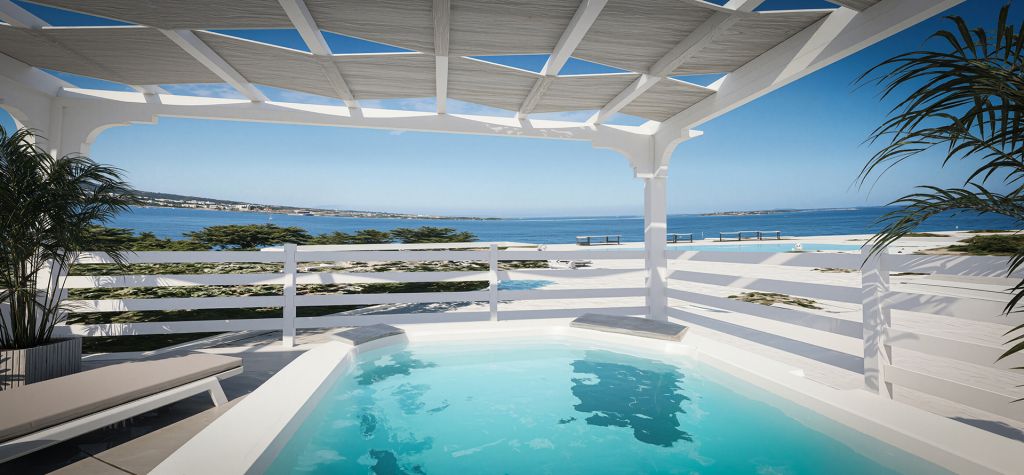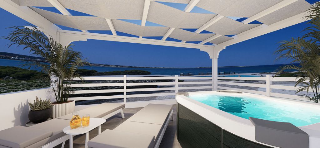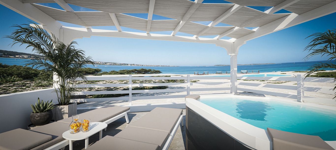 The two-story Junior villa faces a spectacular view of the sea and Santa Maria beach and is welcoming you to bright, stylish spaces set up with three cozy bedrooms—ideal for seven persons. The ground floor consists of a bedroom with a modern en-suite bathroom, a fully equipped kitchen and an open-plan dining room with a lounge area having a dazzling view over the Aegean from the large windows. The second floor is set with two bedrooms, one with a king-size bed and the other with twin beds, along with a large bathroom. The Junior Villa opens out on a balcony and a veranda, both beautifully furnished – the ideal hangouts to unwind relishing the views.